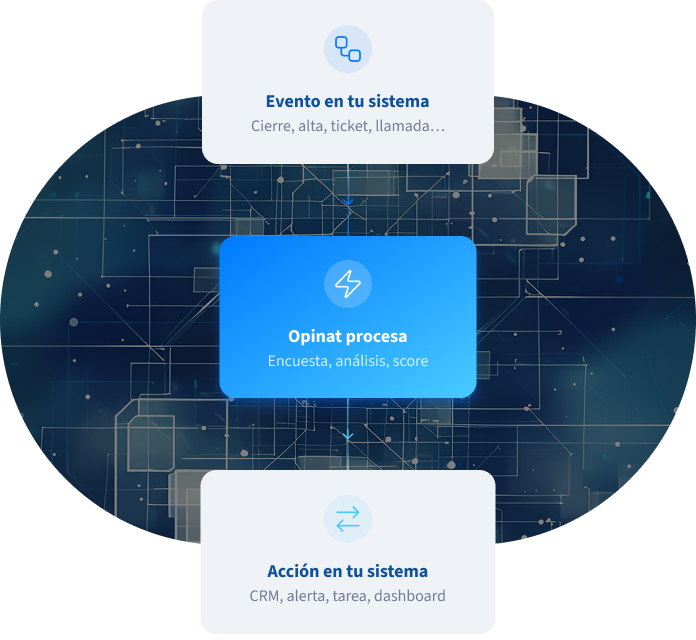 Programa tus sistemas para que se comuniquen con Opinat y envíen las peticiones de encuesta en el momento exacto: tras una facturación, el alta de un servicio o el cierre de un ticket.